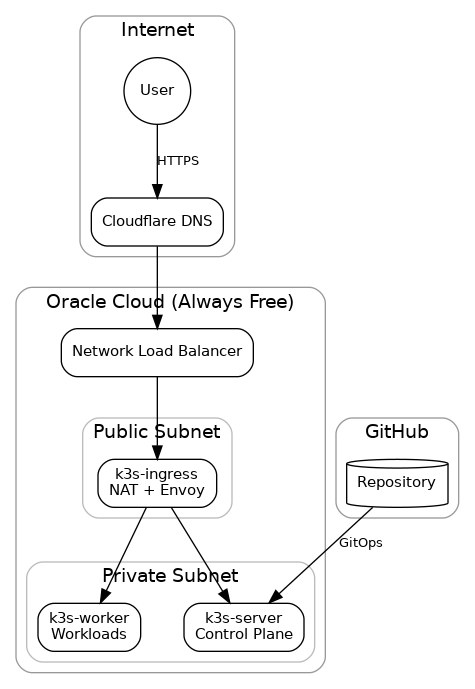 | k3s-ingress | 1 OCPU, 6GB | Public (10.0.1.0/24) | NAT gateway, Envoy Gateway |